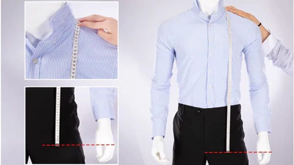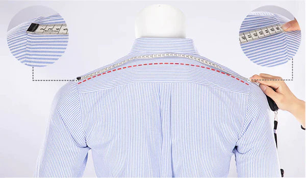Measure between the outermost edges of the shoulders. Good reference points for the start and end are the seams one the edge of the shoulders. Measure across, close to the bowest part of the shirt collar.